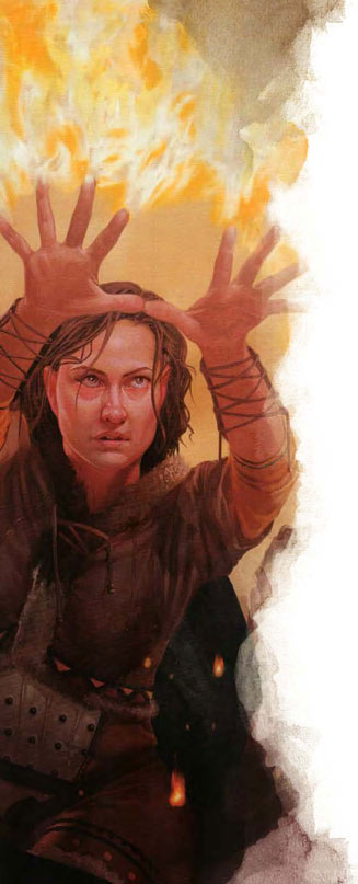 Соединив ладони и растопырив пальцы веером, Вы испускаете из них тонкие языки пламени. Все существа в пределах 15-футового конуса должны пройти испытания Ловкости. Существо получает урон огнём 3к6 в случае провала и половину этого урона в случае успеха.